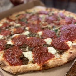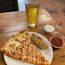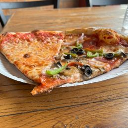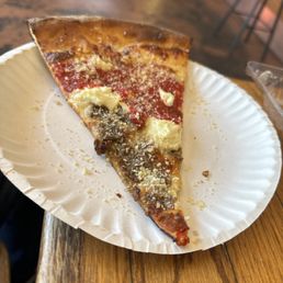 I love this place so much and enjoy ordering by the slice to sample all the flavors. While some are more to my taste than others, overall, it's a fantastic choice. The crust on this pizza is perfection--I even eat the leftover crust my son doesn't finish because it's just that good. My only complaint is that I made the mistake of coming during peak hours on a Friday evening to get slices. There weren't many options available, and the people who ordered ahead of us moved to the left, blocking our view of the pizza selection. It was literally packed. It would be great if they had a way to serve customers outside because it felt like standing in an inferno waiting to order. I felt worse for the employees than for myself.